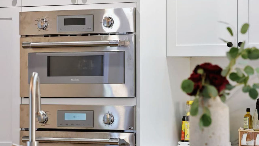 This kitchen exudes timeless charm with a soft, transitional blend of classic and contemporary elements. Crisp white cabinetry offers a clean, bright backdrop, while a natural wood island base adds warmth and texture. The double wall oven stack—sleek and stainless—introduces modern functionality, harmonizing effortlessly with the surrounding palette. A simple floral arrangement in a ceramic vase brings a personal, organic touch, echoing the understated elegance of the space. Every detail feels intentional, curated, and comfortably refined.